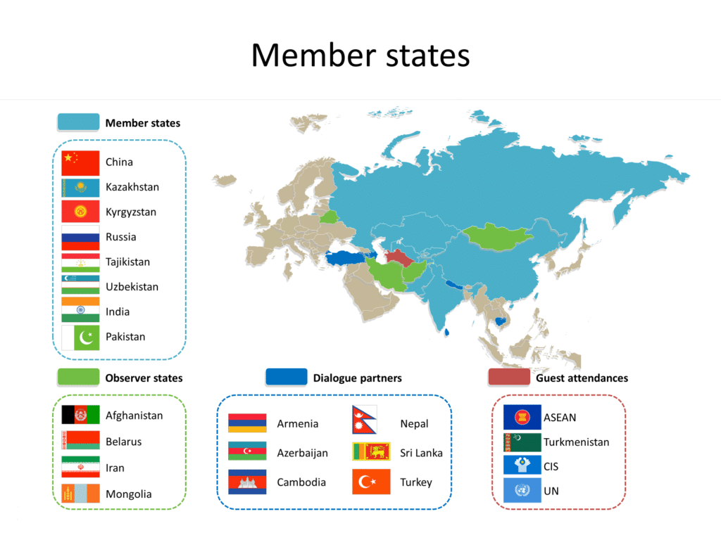 - The members of SCO are: China, Russia, India, Pakistan, Kazakhstan, Kyrgyzstan, Uzbekistan, Tajikistan, and Iran.