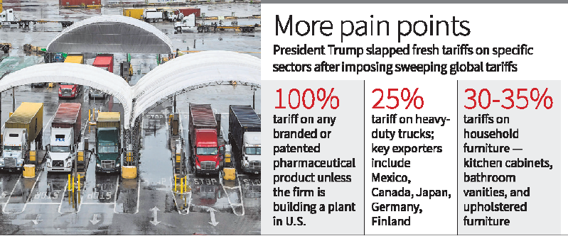 Visual summary of fresh U.S. tariff measures: 100% on branded/pharma unless made in U.S., 25% on heavy-duty trucks (from major exporters), and 30–35% on household furniture.